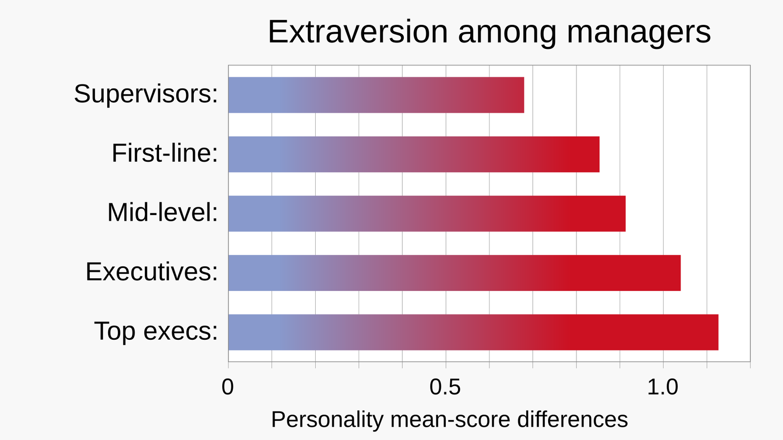 Research indicates that the prevalence of extraversion is greater for people at progressively higher management levels.