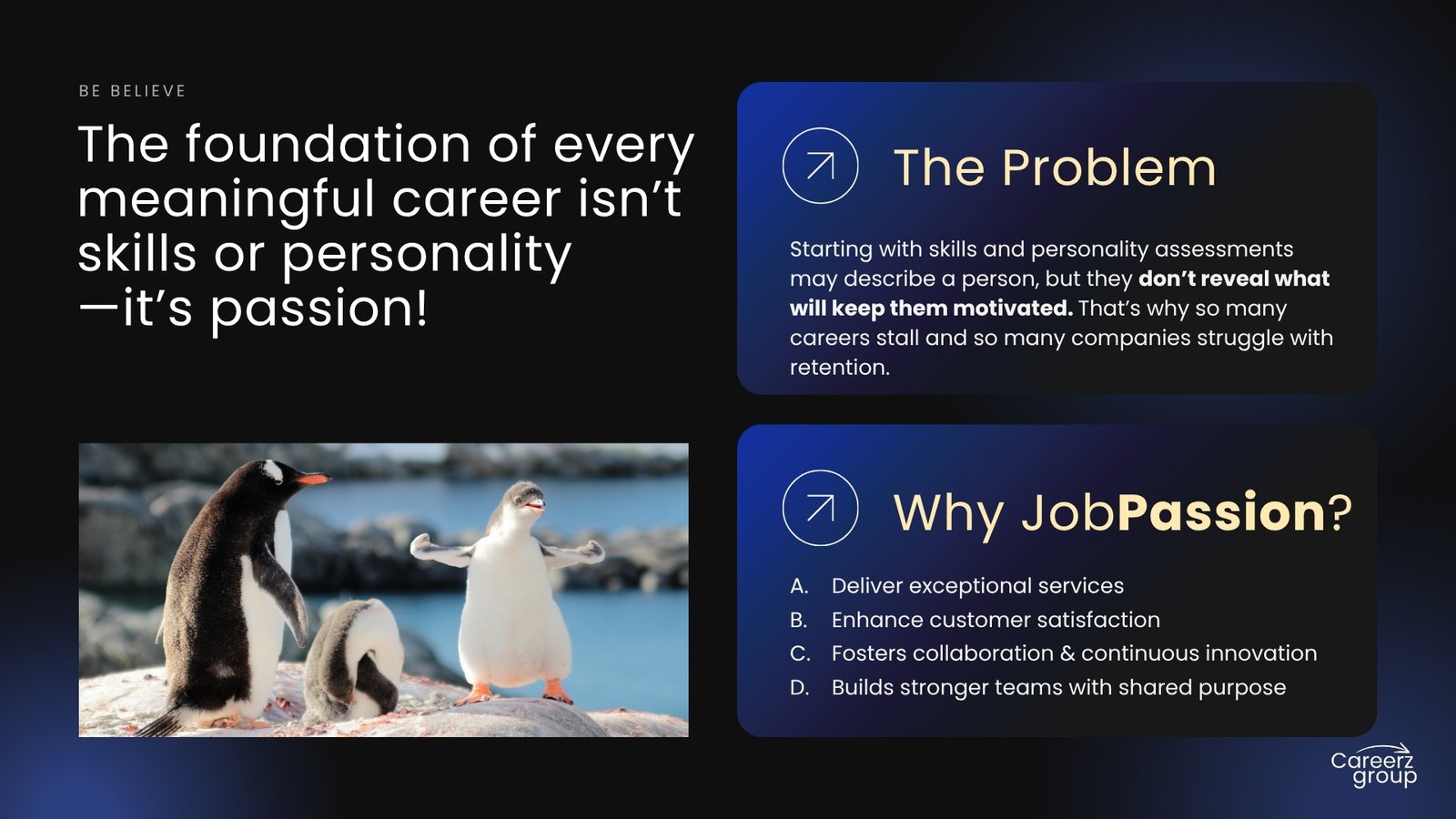 At Careerz Group, we help organizations move from attrition, rework, and burnout to aligned teams that execute with calm confidence. Powered by the Job Passion Type Indicator™ (JPTI) and targeted assessments, we align strengths to roles, install a shared language for feedback and decisions, and develop leaders without the drama.