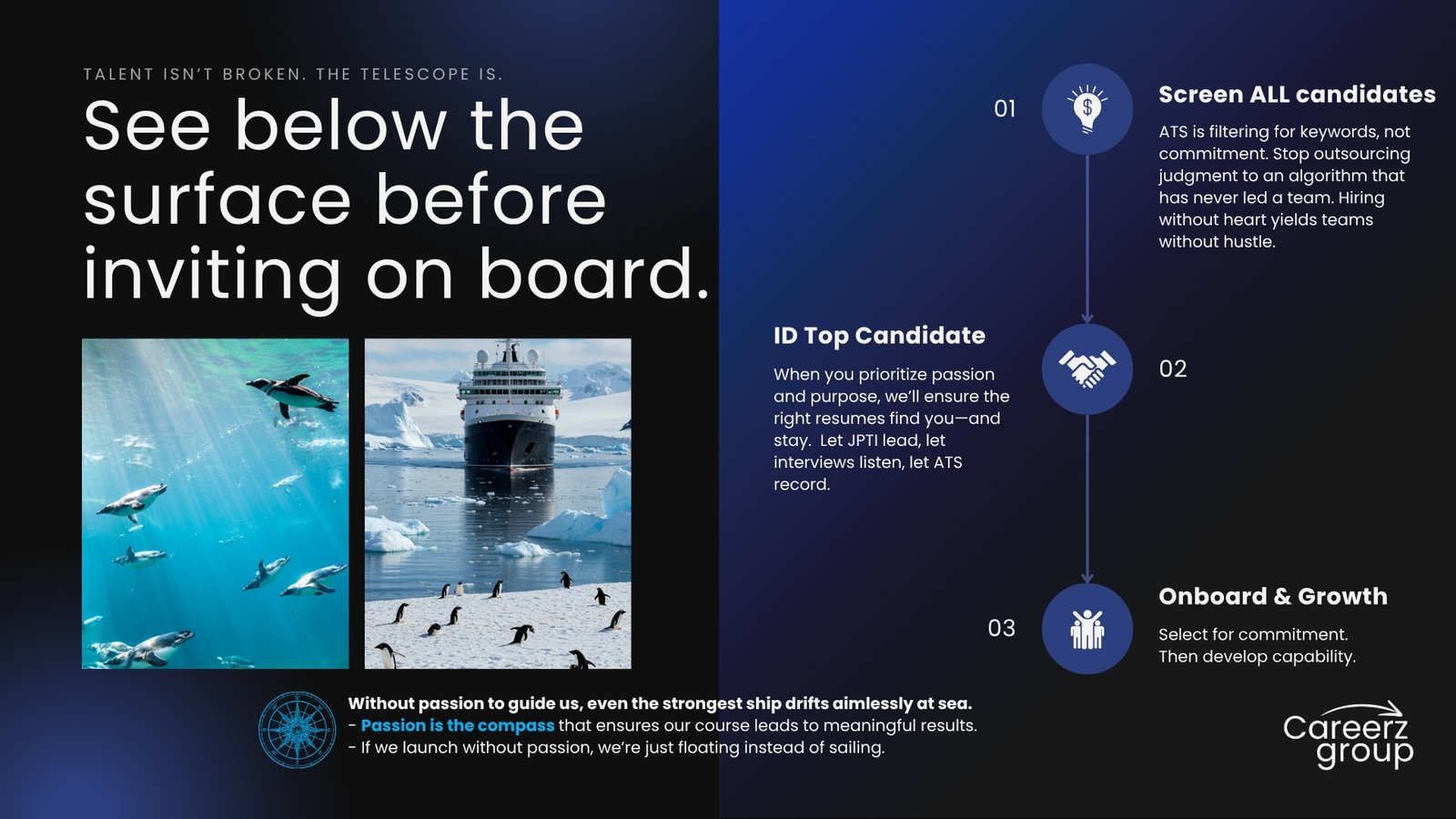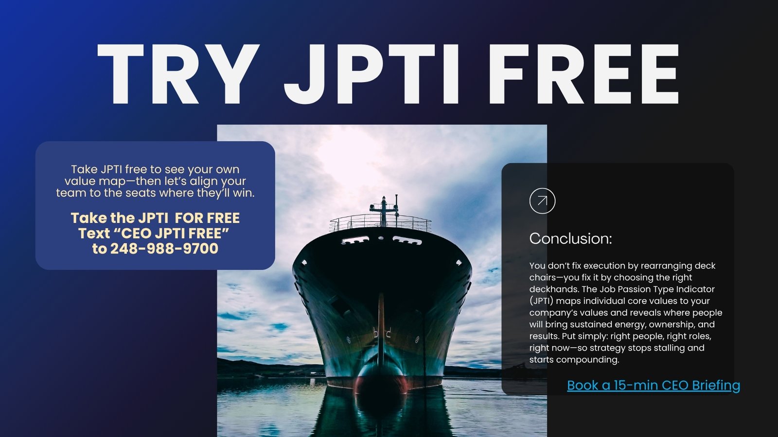 It begins with JPTI™ to surface values, motivators, and role passion.